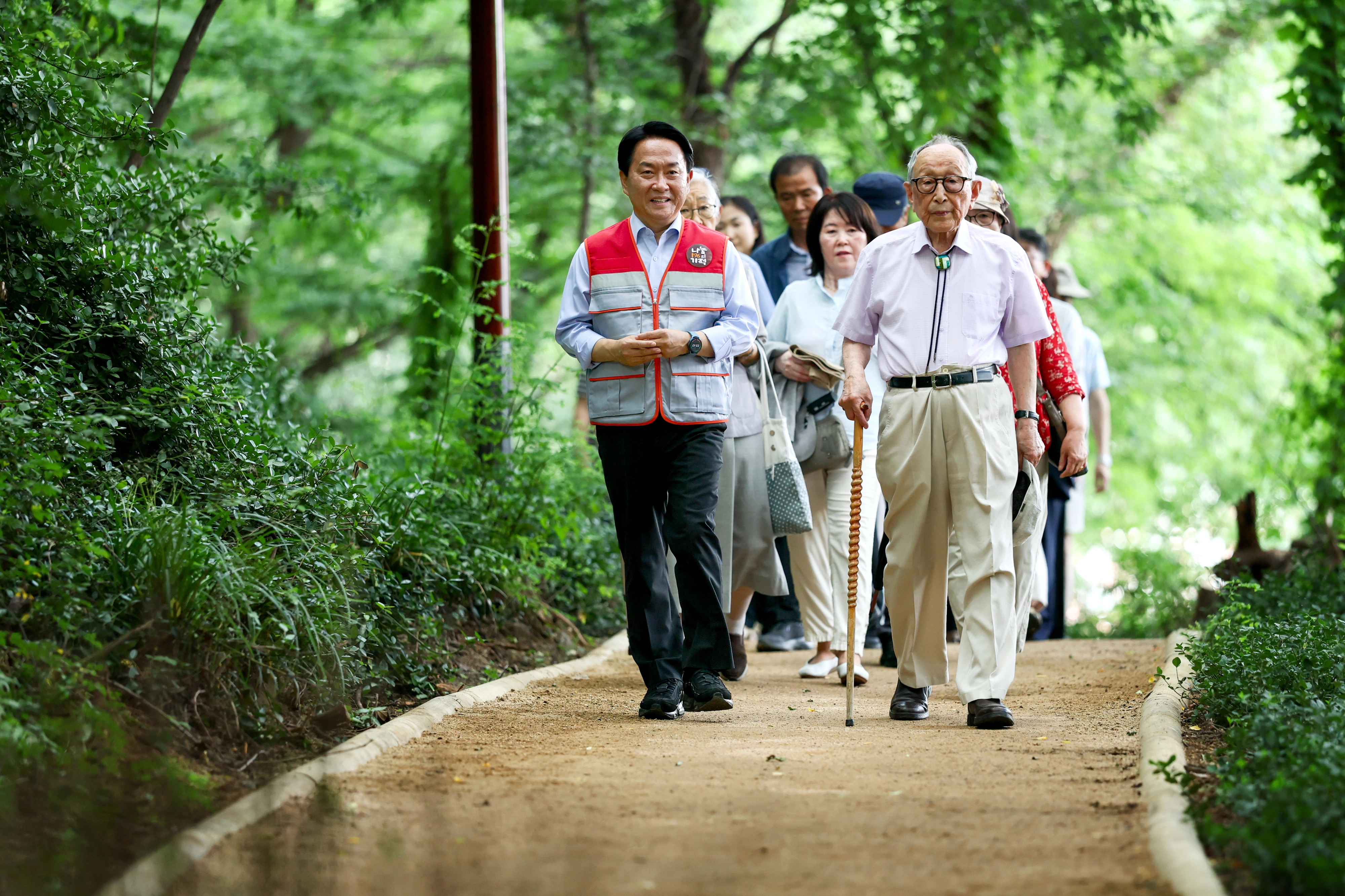 김 교수는 이 길을 걸으면서 “굉장히 부자가 됐다”고 했다. 그는 “내가 가지고 있는 것은 사상”이라며 “책으로, 강의로 나눠줬더니 100살 넘어서도 나눠 주라는 것”이라고 했다. 이어 “구청장이 내 산을 빼앗아 여러분 것이 됐으니 많이 걸으시라. 세상에 많은 것을 나눠 주라”고 강조했다. 김 교수의 호를 딴 작은 정자 ‘송촌정’도 만들어졌다.