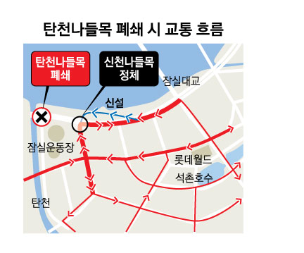 송파구에 따르면 탄천나들목은 탄천 동측도로와 올림픽대로를 연결해 하루 약 5만 7000대의 교통량을 처리하는 교통 요충지다. 여기에 가락시장 현대화 사업, 문정도시개발 사업, 위례신도시 개발 등 대규모 사업이 탄천동측도로 확장을 전제로 수립됐고 이 도로를 이용하려면 탄천나들목을 지나야 한다는 게 송파구의 설명이다. 박 구청장은 “서울시가 주민 반대에도 일체의 해명이나 공청회 없이 계획을 밀어붙이고 있다”며 “생계형 차량들과 주변 아파트 주민들의 고충도 감안해야 한다”고 주장했다.