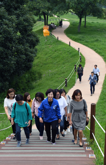 박춘희(앞줄 가운데) 송파구청장이 지난 28일 서울 송파구 올림픽공원 안 몽촌토성 탐방로에 새롭게 설치된 태양열 LED 나무데크 계단을 오르며 주민들과 함께 의견을 나누고 있다.<br>이호정 전문기자 hojeong@seoul.co.kr
