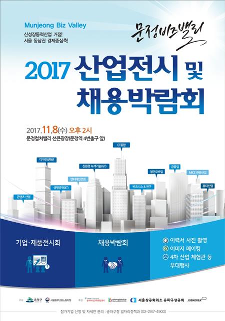 서울 송파구는 문정비즈밸리에 입주한 신성장동력 산업과 유통·서비스·제조업 분야 1300여개 기업이 참여하는 산업전시 및 채용박람회(포스터)를 개최한다고 6일 밝혔다.