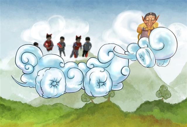 가상현실(VR)을 이용한 ‘체험형 영어 동화구연’에 참여한 아이들이 동화 ‘혹부리 영감과 아기도깨비’에 등장하는 모습. 송파구 제공