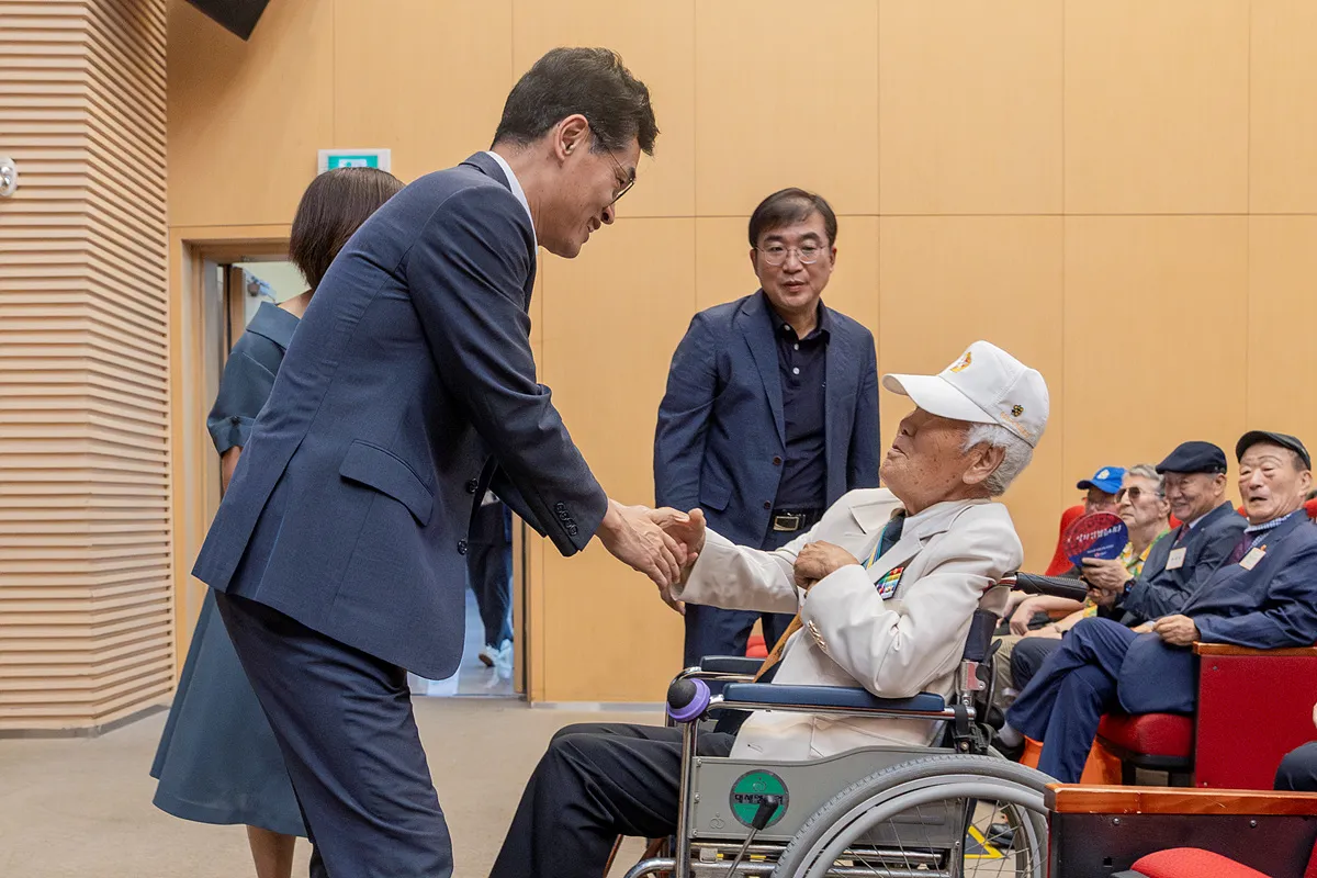 지난해 열린 보훈사랑한마당 행사에서 이기재(왼쪽) 서울 양천구청장이 국가유공자와 인사하고 있다. 양천구 제공