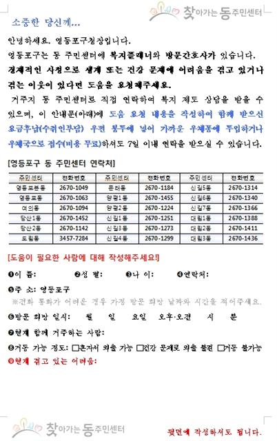 지원을 원하는 사람들은 안내문을 작성해 근처 우체통에 넣으면 된다. 우편료는 없다. 지원자에 한해 동주민센터가 7일 이내로 연락해 복지 서비스 지원방안을 검토한다.