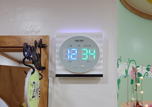 이번에 설치된 측정기는 시계 형태로 미세먼지 농도를 파랑(좋음), 초록(보통), 노랑(나쁨), 빨강(매우 나쁨) 등 색으로 나타내 공기질 상태를 한 눈에 파악할 수 있게 해준다. 시간을 나타내는 숫자의 색상은 실내 미세먼지 농도를 표시하고, 분을 나타내는 숫자의 색상은 국가측정망으로부터 전송받은 실외 미세먼지 농도를 표시한다. 이산화탄소 농도가 증가할 경우 깜박거림으로 환기가 필요하다고 알려준다.
