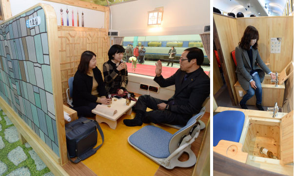 세계 최초로 열차에 한옥식 온돌마루실과 습·건식 족욕 카페 등을 갖춘 서해금빛열차 개통식이 29일 서울역에서 열렸다. 서해금빛열차는 서울 용산역을 출발해 장항선을 따라 아산·예산·홍성·보령·서천·군산·익산 등 서해 7개 지역 관광지를 운행하는 관광 전용 열차다. 새달 5일부터 하루 1차례 왕복 운행된다. 이날 개통식에 참석한 시민들이 온돌 좌석에 앉아 이야기를 나누는가 하면(왼쪽 사진), 족욕 카페에 설치된 족욕기를 살펴보고 있다(오른쪽 사진).