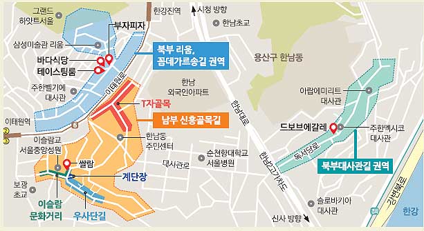 이태원로 북부는 크게 ‘리움 미술관·꼼데가르송길 권역’과 ‘대사관길 권역’으로 나눌 수 있다. 양쪽은 걸어서 가기에 멀찍이 떨어져 있다. 우선 리움 미술관에서 만난 외국인 관광객 라르센(33·여)은 “조용하고 넓은 공간, 한적하고 고급스러운 레스토랑의 분위기가 모국인 덴마크와 흡사하다”면서 “마음이 심란하면 홀로 찾는 곳”이라고 말했다. 또 꼼데가르송길은 고급 식당거리로 유명하다. 지금은 꽤 유명해진 부자피자와 테이스팅룸의 1호점이 있다. 이 두 가게 사이에 있는 바다식당에는 오후 1시가 훌쩍 넘은 시간에도 여기서 점심을 꼭 먹겠다며 많은 사람이 줄을 서 있었다. 이곳은 존슨탕(부대찌개)으로 유명하다.