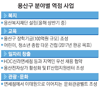 지역 내 일자리 만들기도 풀어야 할 숙제다. 구는 지난달 11일 면세점 협력업체 5곳과 업무 협약을 하고 직원 채용 때 용산 주민을 우선 뽑고 면세사업을 확장해 추가 인력이 필요하면 주민을 채용하겠다는 약속을 받았다.