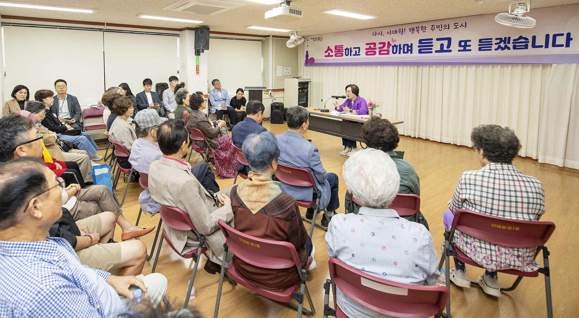 박희영 서울 용산구청장이 지난 7일 이태원1동 주민센터에서 자치회관 프로그램 회원들과 대화하고 있다. 용산구 제공