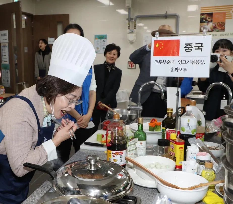 박희영(왼쪽) 서울 용산구청장이 지난 26일 열린 제14회 다문화요리경연대회에서 중국팀의 요리를 맛보고 있다.
