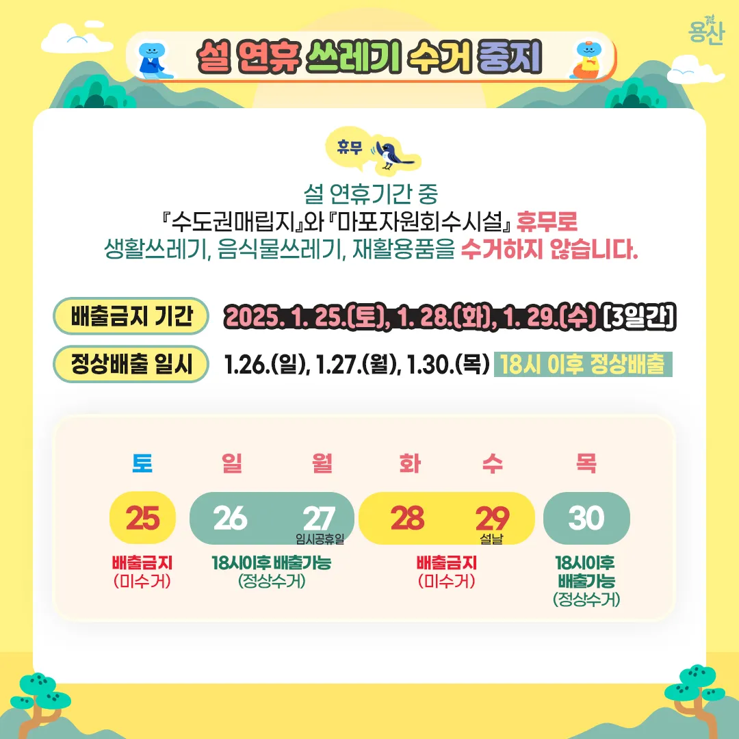 설 연휴 기간인 26, 27, 30일 3일간은 오후 6시 이후에는 쓰레기 정상 배출이 가능하다. 또한 다음달 3일까지 청소 인력과 장비를 총동원해 연휴 동안 쌓인 쓰레기를 신속히 처리할 예정이다.