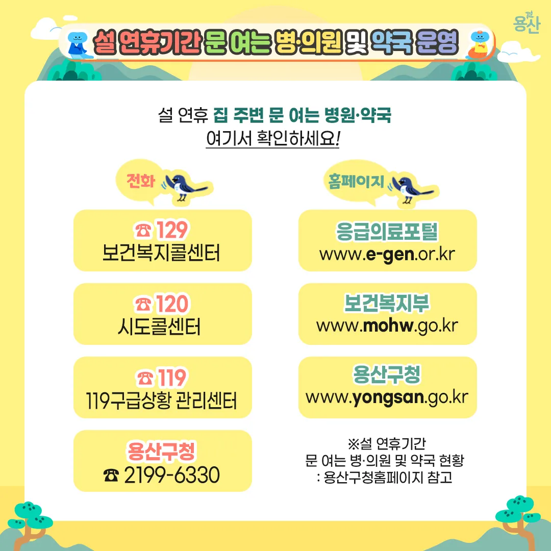 구는 응급환자 발생에 대비해 구청 당직실에 응급진료대책 상황실을 설치·운영한다. 27일과 28일 이틀간은 보건소에 비상진료반이 운영된다. 오전 9시부터 오후 6시까지 보건소 지하 1층에 의사와 간호사가 1명씩 상주해 기본적인 1차 진료 및 응급환자 이송 등을 담당한다. 또한 지역 내 순천향대 부속 서울병원과도 24시간 비상진료 체계를 유지한다.