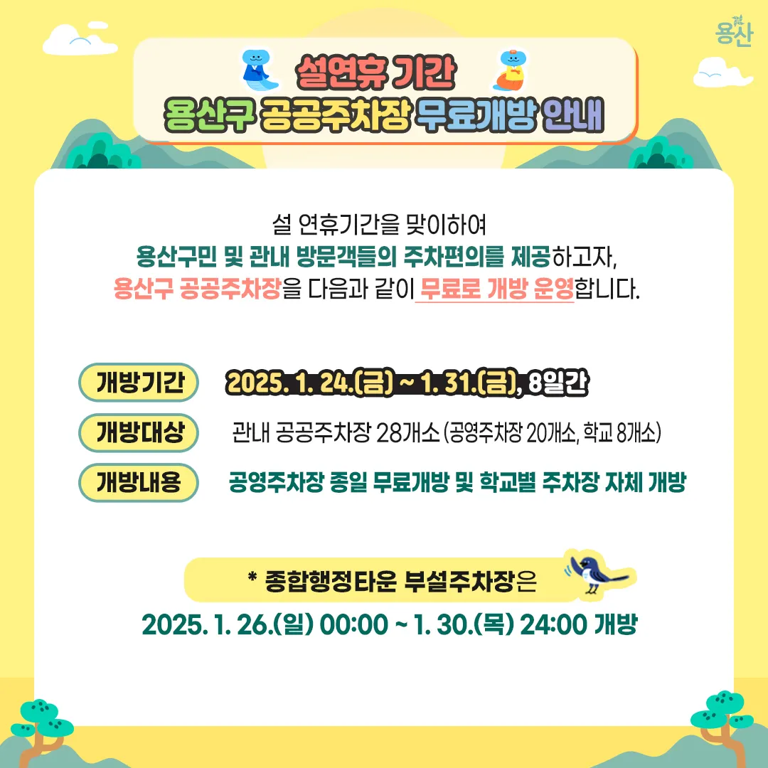 교통과 주차 문제 해결을 위한 대책도 마련했다. 24일부터 용산역 인근에서 법규 위반 택시를 집중적으로 계도하고 단속한다. 설날과 그다음 날인 29일과 30일에는 마을버스를 자정까지 연장 운행한다. 공공주차장 28곳(공영주차장 20곳, 지역 학교 8곳)과 구청 부설주차장을 무료로 개방해 연휴 기간 용산을 방문하는 이들에게 편의를 제공한다.