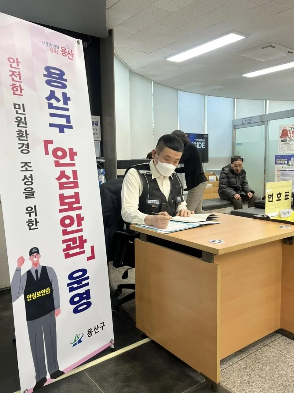 서울 용산구가 지난 17일부터 4개 동주민센터에 안심보안관을 배치하고 시범운영에 돌입했다고 18일 밝혔다. 최근 공무원을 상대로 한 폭언, 폭행, 성희롱 등 민원인의 불법행위가 증가하는 추세에 따른 공무원 보호조치 중 하나다.