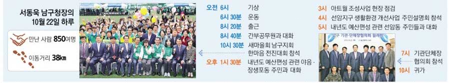 오후 5시에는 선암동 주민센터에서 내년도 예산 편성과 관련해 주민들의 의견을 들었다. 주민들은 대나리마을 입구 횡단보다 위치 조정과 낡은 순찰차량 교체를 건의했다. 앞서 열린 야음·장생포동 주민과의 대화에서는 장생포고래로 배전함 환경 개선과 아트월 고래조형물 정기 세척을 건의받고 예산 편성을 약속하기도 했다. 서 구청장은 주민 간담회 자리에서 일방적인 연설이나 설명을 하지 않는다. 얘기를 들어주고 동행한 관련 부서 공무원들과 함께 가능성 있는 답을 찾아준다. 그래서 주민들은 그를 소통하는 구청장이라 부른다.