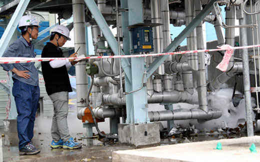 고용노동부 근로감독관이 3일 울산 용연공단 내 효성 3공장 가스배관 폭발사고 현장에서 사고 상황을 살펴보고 있다.   연합뉴스