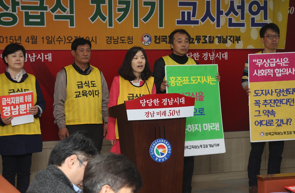 전교조 경남지부 소속 교사들이 1일 오전 경남도청 프레스센터에서 기자회견을 열고 도의 무상급식 지원 중단을 규탄하고 있다. 2015.4.1 연합뉴스