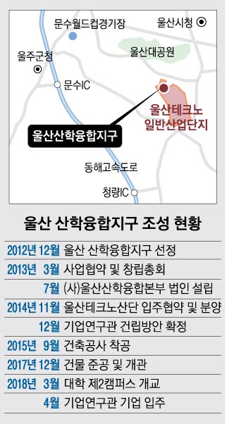 산학융합지구 사업은 ‘울산대관’, ‘UNIST관’, ‘기업연구관’ 등으로 조성됐다. 울산시, 울산대, 울산과학기술원(UNIST), 울산과학대, 울산테크노파크, 한국산업단지공단 울산지역본부, 한국화학연구원, 한국화학융합시험연구원 등 8개 기관이 참여했다.