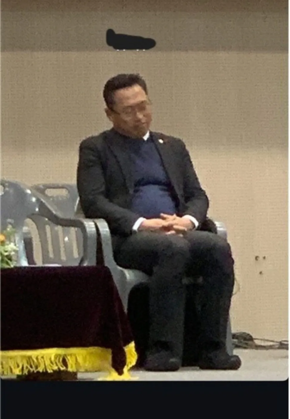홍성표 전 충남 아산시의회 의장이 지난 10일 한 고교 졸업식장 단상에서 조는 듯한 모습을 보이고 있다. 독자 제공