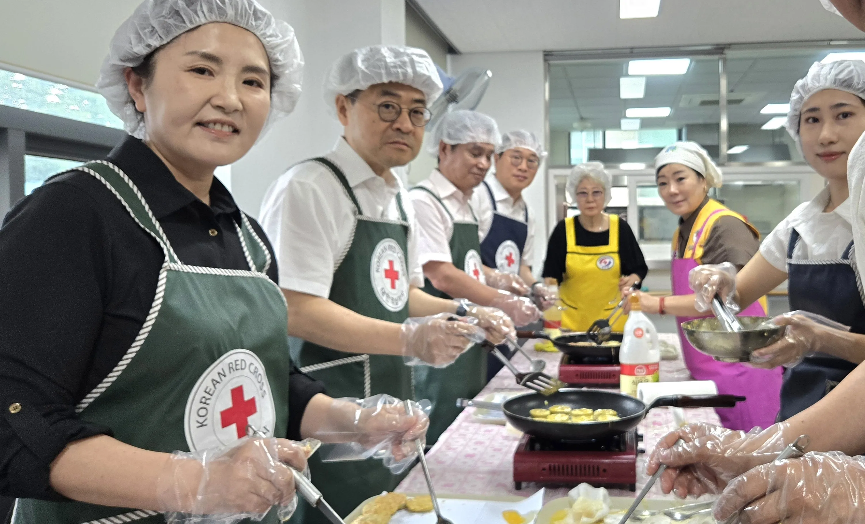 대전지검 천안지청 성상욱 지청장(왼쪽 두 번째)과 김민아 차장검사 등 직원들이 16일 오전 천안적십자봉사관에서 봉사원들과 함께 노숙자 등을 위한 무료 급식 봉사활동을 펼치고 있다.