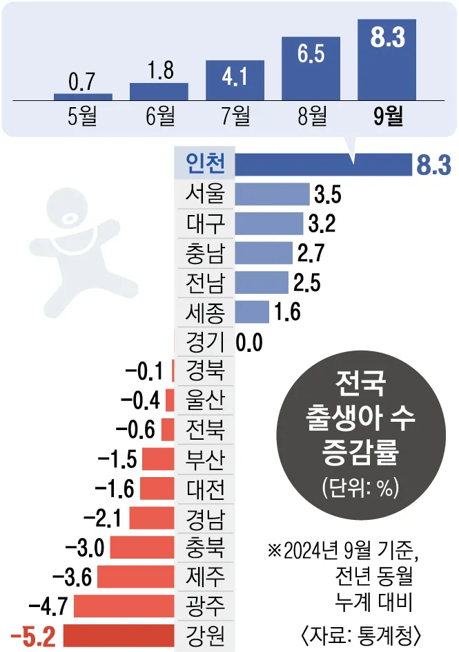 8일 통계청이 지난해 11월 27일 발표한 2024년 9월 인구 동향에 따르면 출생아 수가 8.3% 늘어난 것은 17개 시도 중 가장 높은 수치다. 서울(3.5%), 대구(3.2%), 충남(2.7%) 등을 크게 앞섰다. 전국 평균 출생아 증가율은 0.7%다.