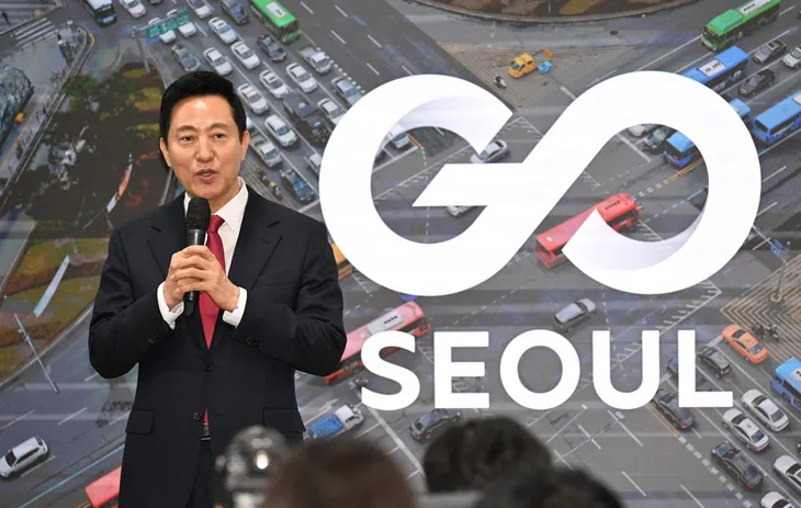 오세훈 서울시장이 24일 오전 서울시청 브리핑룸에서 서울시 교통 통합 브랜드 ‘GO SEOUL(고 서울)’을 소개하고 있다. 도준석 전문기자