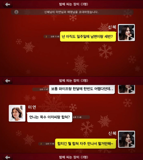 이어 신혜는 미연(문소리 분)을 향해서도 ”아직도 남편이랑 일주일에 세 번?”이라는 질문을 던졌다. 미연은 “결혼할 때부터 딱 못 박아 놓은 것”이라고 당당하게 답해 눈길을 끌었다. 또 딸 눈치가 보인다는 싱글맘 해영은 “내 혀도 다른 것 좀 맛보고 살면 안되니?”라며 푸념을 늘어놓았다.