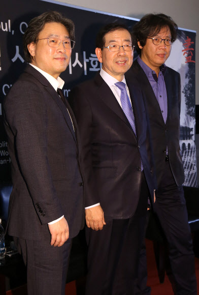 11일 오후 종로구 돈화문로 서울극장에서 열린 영화 ’고진감래’ 글로벌 시민 시사회에서 박찬욱 감독(왼쪽부터), 박원순 서울 시장, 박찬경 감독이 포즈를 취하고 있다.