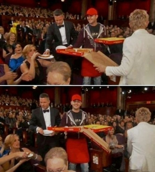 이날 아내인 배우 안젤리나 졸리와 함께 시상식에 참석한 브래드 피트는 피자가 등장하자 자리에서 벌떡 일어나 턱시도 차림으로 피자를 서빙했다. 메릴 스트립을 비롯해 레오나르도 디카프리오, 마틴 스콜세지 등 배우들은 피자 한 조각씩을 받아 들고 미소를 지었다.