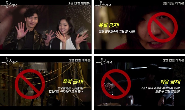 영화 ‘몬스터’ 주연배우 이민기 김고은은 최근 개강 시즌을 맞아 욕설 금지, 폭력 금지, 침 뱉기 금지, 과음 금지 등 신학기에 꼭 지켜야 할 에티켓을 영상으로 만들어 공개했다.