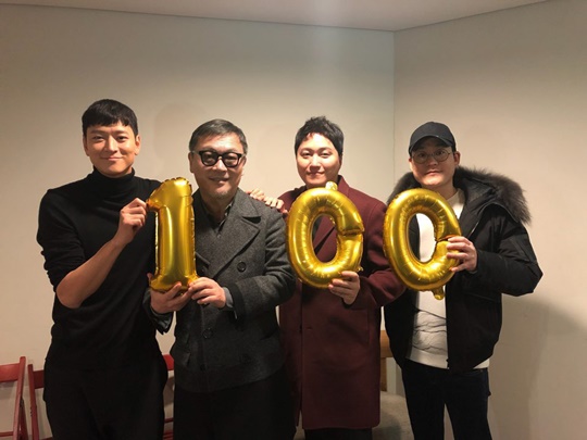 배우 강동원, 김의성, 김대명, 김성균은 ‘100’이라는 숫자 풍선을 들고 기쁨에 찬 표정을 짓고 있다. 특히 사이좋게 ‘1’을 나눠든 강동원과 김의성의 다정한 모습이 눈길을 끌었다.