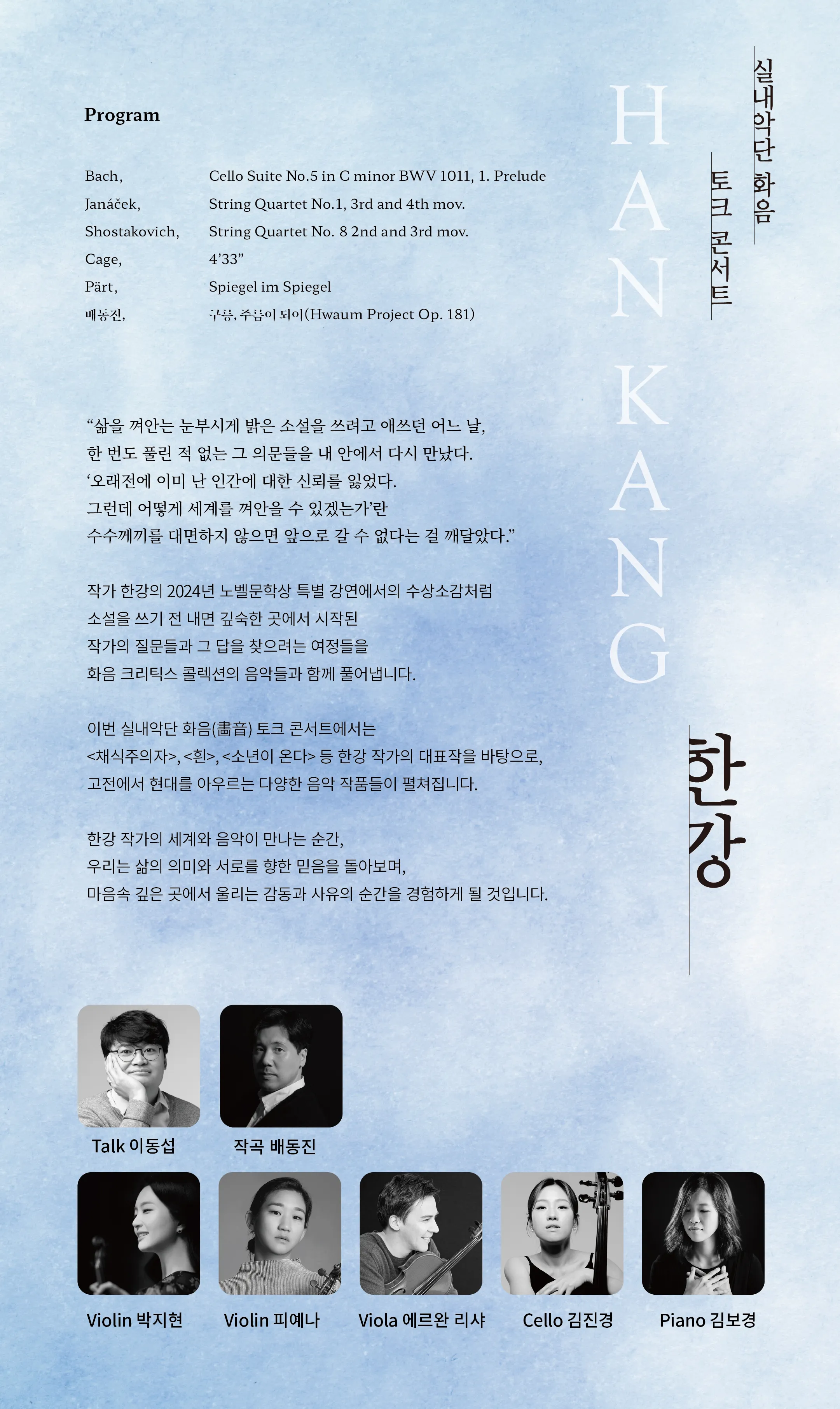 예술인문학자 이동섭의 강연으로 진행된다. 한강의 대표작 ‘채식주의자’, ‘흰’, ‘소년이 온다’ 등을 실내악단 화음이 음악적으로 해석한다. 지난해 노벨상 시상식에서 연주됐던 요한 제바스티안 바흐의 ‘첼로 모음곡 5번’과 함께 레오시 야나체크의 ‘크로이처 소나타’, 아르보 패르트의 ‘거울 속의 거울’ 등이 함께 연주된다.