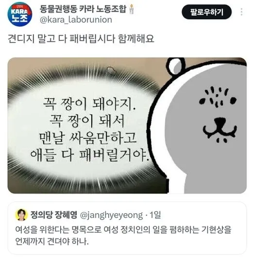 카라 노조는 그러면서 전날 장 전 의원의 엑스 게시물을 인용했다. 장 전 의원은 “여성을 위한다는 명목으로 여성 정치인의 일을 폄하하는 기현상을 언제까지 견뎌야 하나”라는 글을 올렸는데 카라 노조는 이같은 글에 “패버립시다”라는 게시물을 올리면서 장 전 의원에게 힘이 돼주려던 것으로 추측된다.