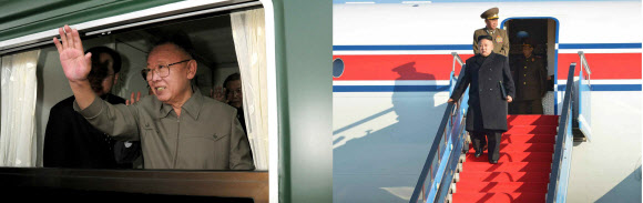 이동수단 다른 父子  북한 노동당 기관지인 노동신문이 2일 김정은 국방위원회 제1위원장이 지방 시찰에 비행기를 이용하는 모습을 처음으로 공개했다. 아버지 김정일 국방위원장이 지방 시찰은 물론 해외 방문 때도 열차를 고집했던 것과 대조적이어서 눈길을 끈다. 오른쪽 사진은 김 제1위원장이 인민군 연합부대 지휘관 결의대회 참석을 위해 지난 1일 백두산 부근 삼지연비행장에 도착한 뒤 비행기에서 내리는 장면. 왼쪽 사진은 김 국방위원장이 2010년 5월 중국 비공식 방문을 마치고 베이징역에서 중국의 지도 간부들에게 차창 밖으로 손을 흔들며 작별 인사를 하는 장면. <br>연합뉴스