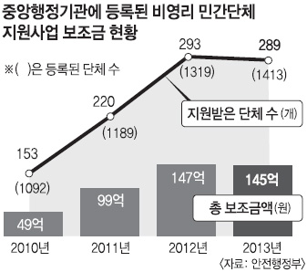 그럼에도 비영리 민간단체 공익사업에 편성되는 보조금 총예산액과 등록단체 수는 증가세를 보이고 있다. 중앙행정기관에 등록된 민간단체 수는 2010년 1092개에서 지난해 1413개로 22.7% 늘었다. 지원 금액은 같은 기간에 49억원에서 145억원으로 66.2% 증가하는 등 큰 폭으로 뛰었다.