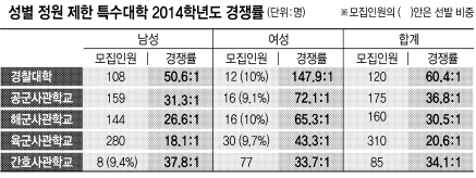 10일 국방부와 경찰청 등에 따르면 육해공군 사관학교와 경찰대 등 4개 학교의 2014학년도 입시에서 입학 정원이 10% 안팎으로 제한된 여성의 경쟁률이 남성에 비해 2.3~2.9배나 높았다. 반면 국군간호사관학교의 경우 총정원의 10%만 뽑는 남성의 입시 경쟁률이 여성보다 훨씬 높다. 남성 경쟁률은 첫해인 2012학년도에 94.3대1(여성 37.2대1)이나 된 데 이어 2013학년도 51대1(여성 36.9대1), 2014학년도 37.8대1(여성 33.7대1)을 기록했다. 입학 정원이 제한되다 보니 성별 입학 경쟁률이 큰 차이를 보이는 것이다.