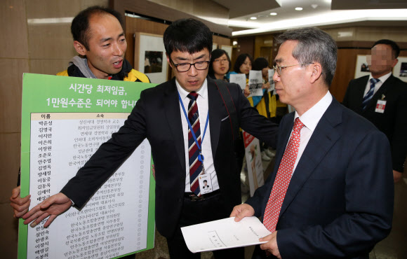 올해 첫 최저임금위원회 전체회의가 열린 지난 11일 서울 중구 한국프레스센터 회의장 앞에서 알바노조 회원들이 최저임금 인상을 요구하는 피켓 시위를 하는 가운데 박준성(앞줄 오른쪽) 최저임금위원회 위원장이 회의장에 들어서고 있다.