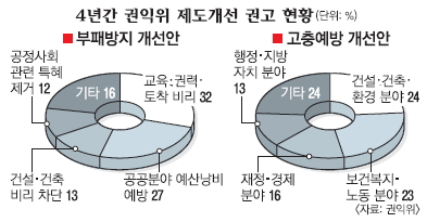 제도개선 권고 실적도 권익위 출범 이전 4년간(2004~2007년)과 비교했을 때 크게 늘었다. 권익위에 따르면 출범 이전 4년간 제안된 부패방지 개선안은 연평균 11건이었던 것이 출범 이후 20건으로 82%나 증가했고, 고충예방 개선안도 연평균 71건이던 것이 268건으로 277%나 뛰었다.