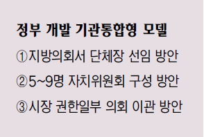 정부가 소규모 기초자치단체를 대상으로 지방의회 의원들이 간선으로 단체장을 선발하는 ‘기관통합형’ 자치제 도입을 검토하고 있다. 일종의 내각제 형식으로 이르면 다음 지방선거부터 도입될 수 있다. 지방자치가 도입된 지 20년이 넘었지만 현행 자치제도에 부작용이 많다는 지적과 국가 발전과 지역균형 발전을 위해 획일적인 지방자치를 다양화해야 한다는 목소리를 반영한 것이다.