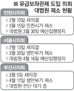 지방의회의 유급보좌관제 도입 조례 제정 강행에 대법원이 잇따라 제동을 걸었다.17일 행정안전부에 따르면 지난 16일 대법원이 서울시의회 유급보좌관제 도입과 관련, 행안부의 예산집행정지가처분 신청을 받아들였다. 이에 따라 서울시가 지난 2월 98명을 뽑아 의회에 배치한 청년인턴에 대한 급여 15억원의 지급이 불투명해졌다.