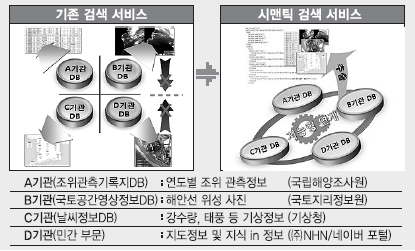 하지만 시맨틱 검색 서비스를 이용하면 국립해양조사원의 ‘연도별 조위관측 정보’와 국토지리정보원의 ‘해안선 위성사진’, 기상청의 강수량·태풍 등 기상정보, 네이버 등의 지도 정보를 한꺼번에 볼 수 있게 된다. 그에 따라 민간개발자라면 이를 기반으로 ‘바다 낚시 가이드’를 애플리케이션으로 개발하고, 행정기관이라면 해안 방재 정책 수립의 기초 자료로 활용할 수도 있게 된다.