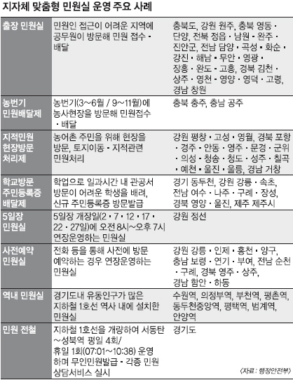 농번기 민원 배달제, 5일장 민원실, 전철 민원실 등 ‘현장 맞춤형 민원실’이 인기다.31일 행정안전부가 전국 지방자치단체 민원실 운영실태를 파악한 결과 92%인 210개 지자체가 ‘일과시간 외 민원실’을 운영하는 것으로 나타났다. 이는 2010년(91개)과 지난해(153개)보다 늘어난 것이다. 대부분의 지자체에서 맞벌이 부부나 직장인 등이 여권·인감·가족관계·주민등록 등 직접 방문해야 하는 민원서비스를 일과시간 외에 편하게 이용할 수 있게 됐다.