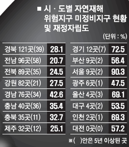 재정자립도가 낮은 지방자치단체일수록 자연재해 위험도 큰 것으로 조사됐다.11일 소방방재청에 따르면 전국 자연재해 위험지구 중 정비되지 않은 지구가 가장 많은 지역은 재정자립도가 최하위권인 경북(121곳)인 것으로 나타났다. 이와 함께 재정자립도가 20.7~28.1%로 전국 꼴찌 수준인 전남(96곳), 전북(89곳), 강원(82곳) 등도 미정비지구가 많은 지역으로 꼽혔다. 반면 도 지역 가운데 재정자립도가 가장 높은 경기도(72.5%)의 경우 미정비 위험지구는 12곳뿐이었다.