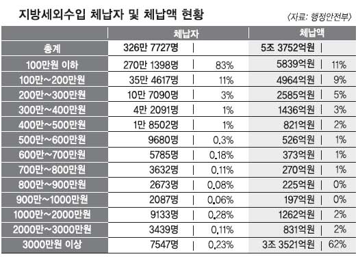 문제는 고액 체납자다. 3000만원 이상 고액 체납자는 7547명으로 0.23%에 그치지만 체납액만 놓고 보면 무려 3조 3521억원으로 전체 체납액의 62%를 차지하고 있다. 전형적인 악성 상습 고액 체납자들이다. 행정안전부가 ‘지방세외수입 과세징수법’을 제정하는 것은 사실상 이들을 겨냥한 것이다. 또한 1000만~3000만원 사이에도 1만 2572명이 2093억원을 체납하고 있다.