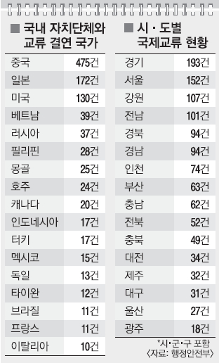 국내 자치단체들이 교류를 가장 많이 맺는 상대국은 중국으로, 475개의 성(省) 또는 시(市)가 국내 지자체와 고리를 엮고 있었다. 다음으로는 일본(172개)-미국(130개)-베트남(39개)-러시아(37개)-필리핀(28개) 순이었다.