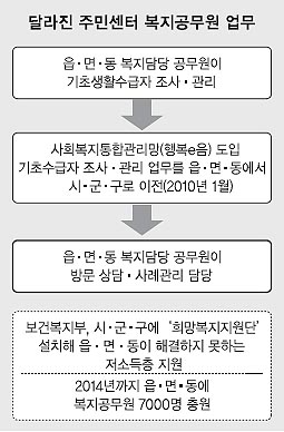 이러한 변화는 지난해부터 본격화되기 시작했다. 2010년 복지지원 대상자들의 정보를 데이터베이스로 구축한 사회복지통합관리망(사통망)이 도입되면서 기초수급자 등 복지지원 대상자들에 대한 조사·관리 업무가 읍·면·동에서 시·군·구로 이전됐다. 읍·면·동의 복지담당 공무원들이 보다 적극적인 복지 지원에 나설 수 있는 여력이 생긴 것이다. 차상위계층 등 기존의 복지지원제도가 미치지 못하는 ‘사각지대’가 늘어나면서 어려운 이웃을 발굴하고 도움을 줄 필요성이 커진 것도 또 다른 배경이다.