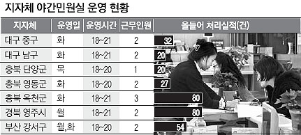 경북 영주시는 매주 월요일 오후 9시까지 야간 민원실을 운영한다. 직원 2명이 올 들어 모두 80건을 처리했다. 경북 경산시는 직원 2~3명이 매주 평균 5~6건의 야간 민원을 처리하고 있다. 대부분 여권업무다. 부산 강서구도 지난 1년간 처리실적이 54건에 그쳤다. 강서구 관계자는 “주민들 봉사 차원에서 야간 민원실을 운영하고 있다.”고 말했다.