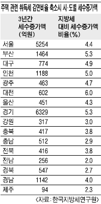 연구보고서에 따르면 앞으로 3년간 주택거래량이 2009~2010년의 평균 수준일 경우 지방세 수입 증가분은 2조 1345억원, 시간 경과에 따른 여러 변수를 통해 산출한 시계열모형으로 보면 3년간 지방세수 증가액은 1조 9107억원인 것으로 각각 집계됐다. 시·도별 세수증가액은 특별·광역시가 1조 196억원, 도는 1조 30억원 늘어나고 경기도가 6329억원, 서울이 5254억원, 부산 1464억원 등의 순이었다. 또 지방세 대비 세수증가액 비율은 대전이 6.0%로 가장 높았고, 경북은 2.7%로 가장 낮은 것으로 추계됐다. 이번 추계는 주택 관련 취득세 감면비율을 매년 5% 포인트씩 축소할 경우와 주택거래량 감소 등을 종합적으로 고려한 결과다.