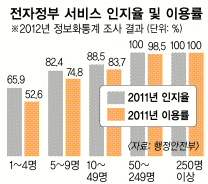 50~249명 사업장의 이용률이 98.5%, 250명 이상 사업장이 100%인 데 반해 5~9명 사업체는 74.8%, 1~4명 사업체는 52.6% 등 10명 미만 사업장의 전체 이용률은 60.1%에 머물렀다. 전자정부서비스의 혜택이 아직까지 소규모 영세 사업장에는 제대로 미치지 못하는 열악한 수준임이 드러난 셈이다.