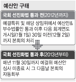 연중행사나 다름없었던 예산안 늑장처리 구태가 올해부터는 사라질 수 있을지 주목된다. 지난해 5월 통과된 국회 선진화법이 오는 5월부터 시행되기 때문이다. 국회 선진화법은 예산안과 세입예산 부수법안이 헌법상 의결기한(12월 2일)의 48시간 전까지 예결위 심사를 마치지 못하면 본회의에 자동으로 회부되도록 규정하고 있다. 다만 이것도 최소한의 방지책일 뿐 여야가 본회의에서 장기 대치하는 상황이 벌어지면 유명무실해질 수 있다는 지적이 나온다.