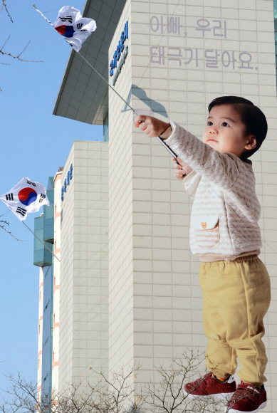 4일 서울 영등포구 여의도의 국가보훈처에 한 어린이가 고사리 손으로 태극기를 내걸고 있는 모습의 광고가 설치돼 눈길을 끌고 있다. ‘아빠, 우리 태극기 달아요’라는 주제의 이 옥외 광고는 세계적 전문가 이제석씨의 재능기부로 이뤄진 것이다.
